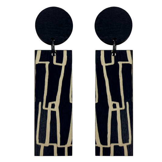 Contemporary sustainable earrings hand made in Australia from recycled plywood. We use surgical steel for ear posts and sterling silver for dangle earrings.