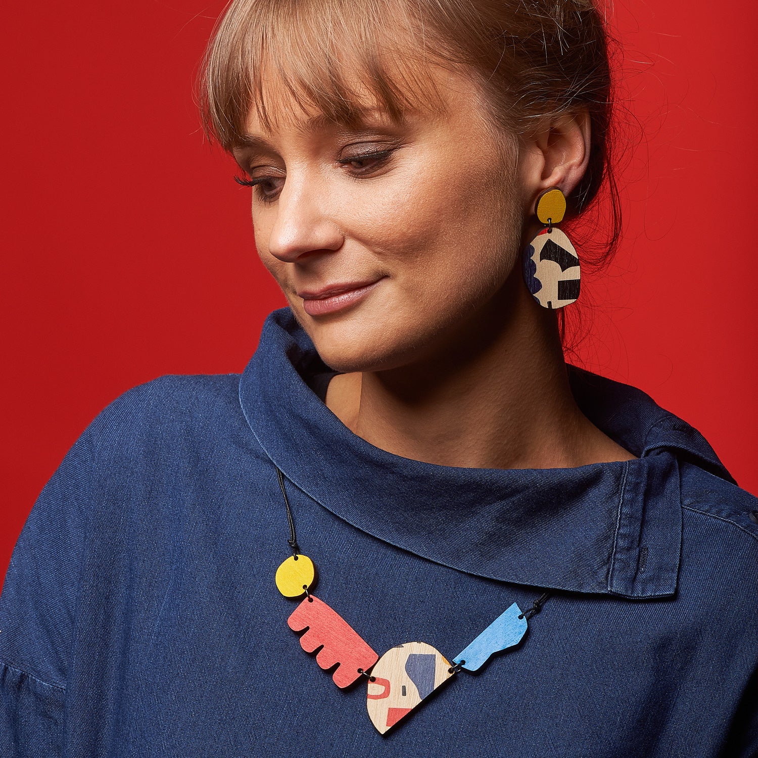 Part of our abstract range, these statement earrings are hand made using screen printed plywood. Perfect to jazz up your outfit or add a spot of colour. Stud earrings are made with surgical steel ear posts and come packaged in a beautiful box.
