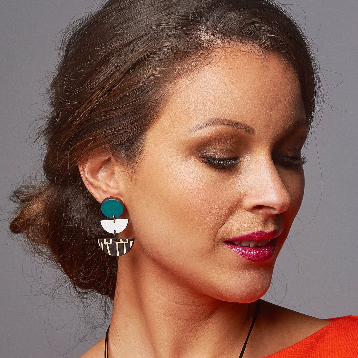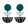 3 tiered wooden city earrings with teal and white