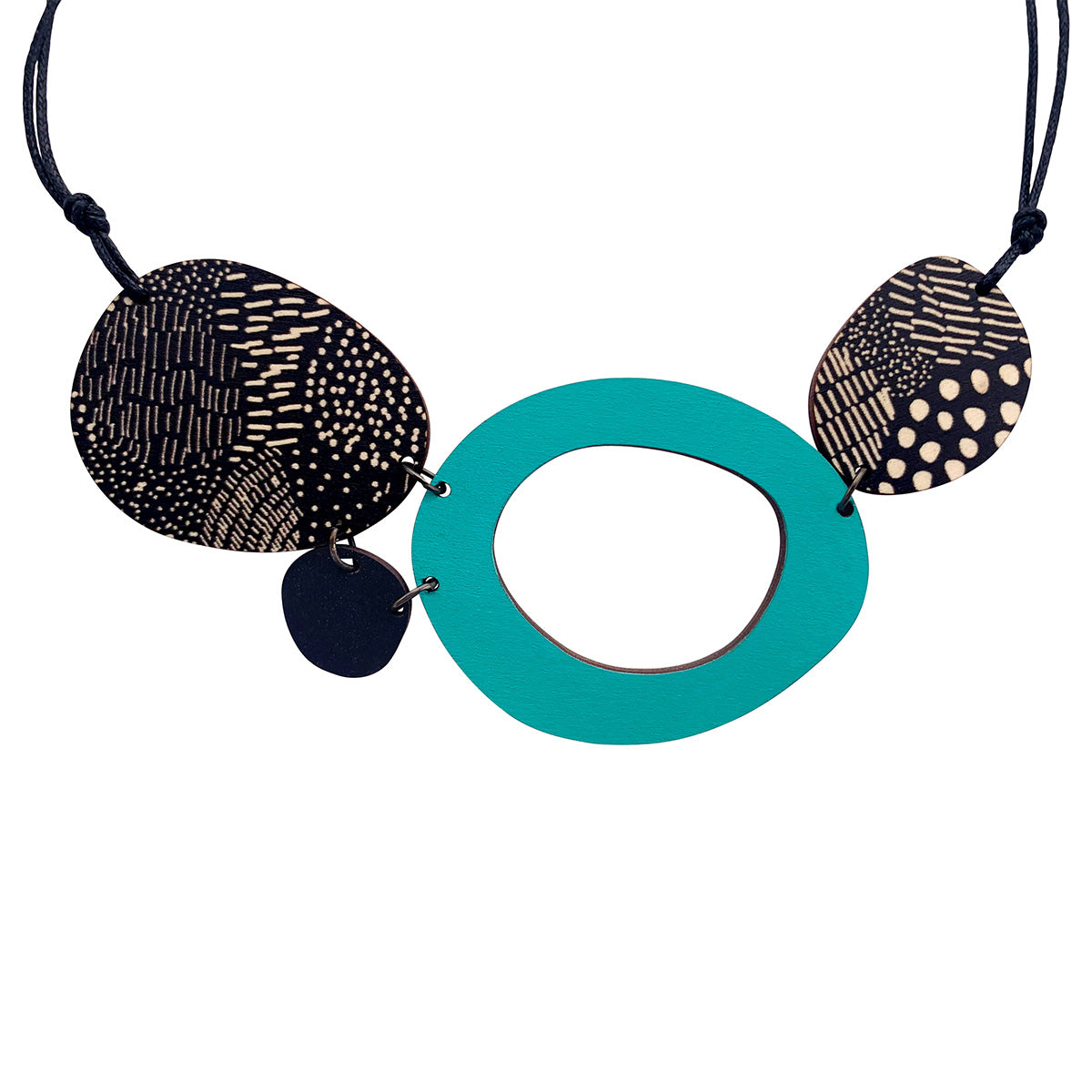 Part of our Night Garden range, this bold necklace adds a splash of colour to your outfit. The necklace is 11.5 cm wide, 7 cm high and 0.3 cm deep. The ties are made from cotton cord and are 40 cm long allowing the necklace to sit mid length or high on the neck.
