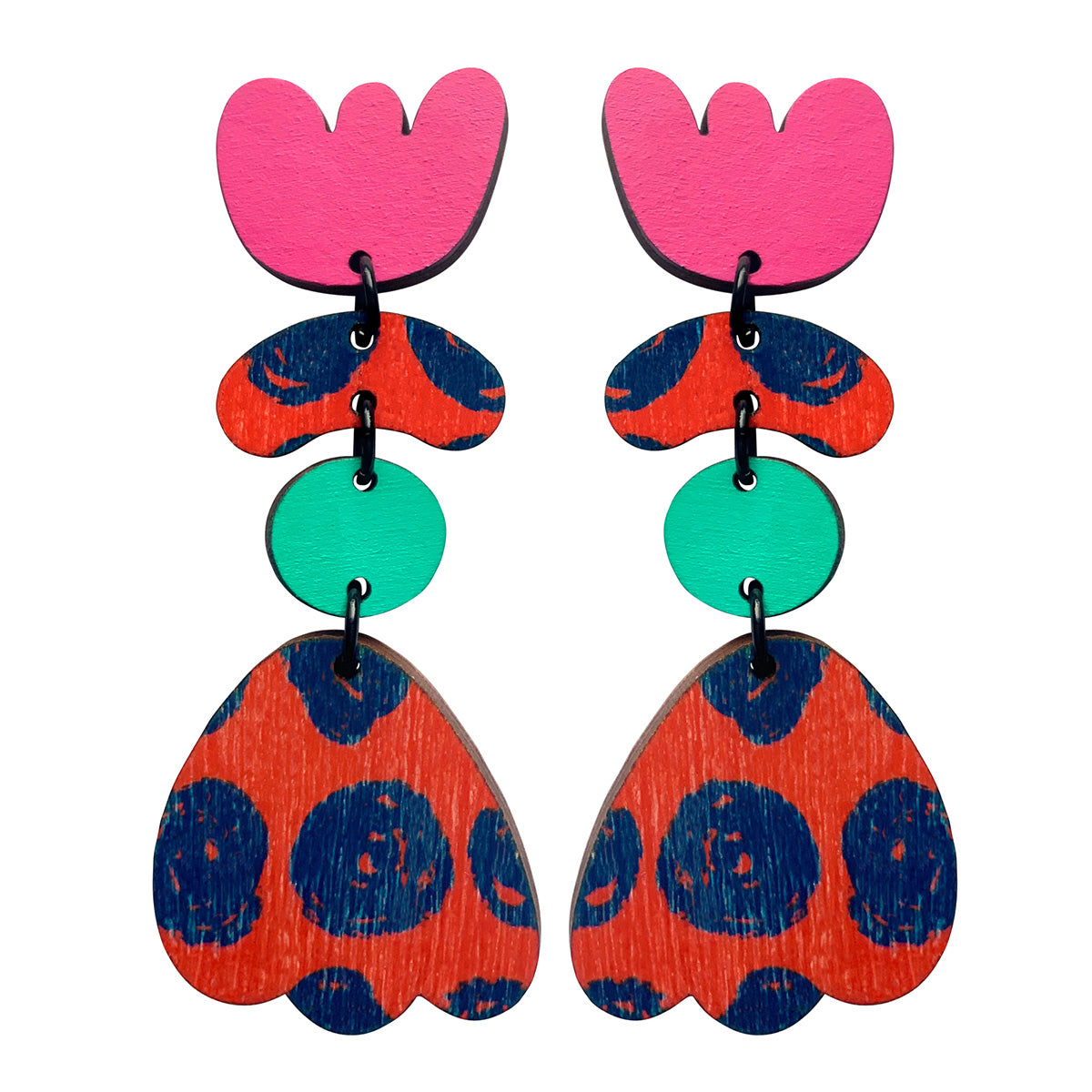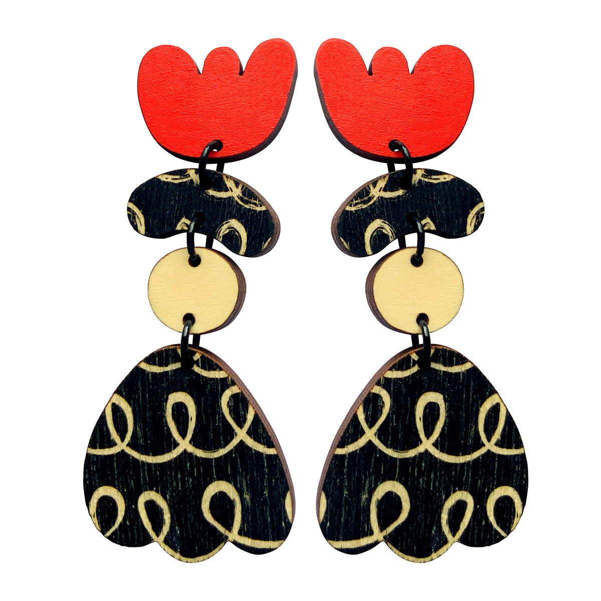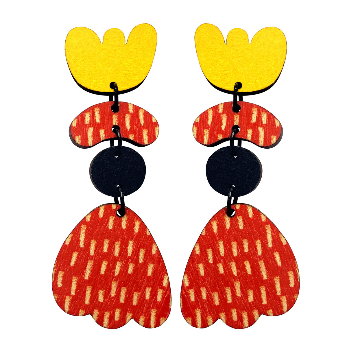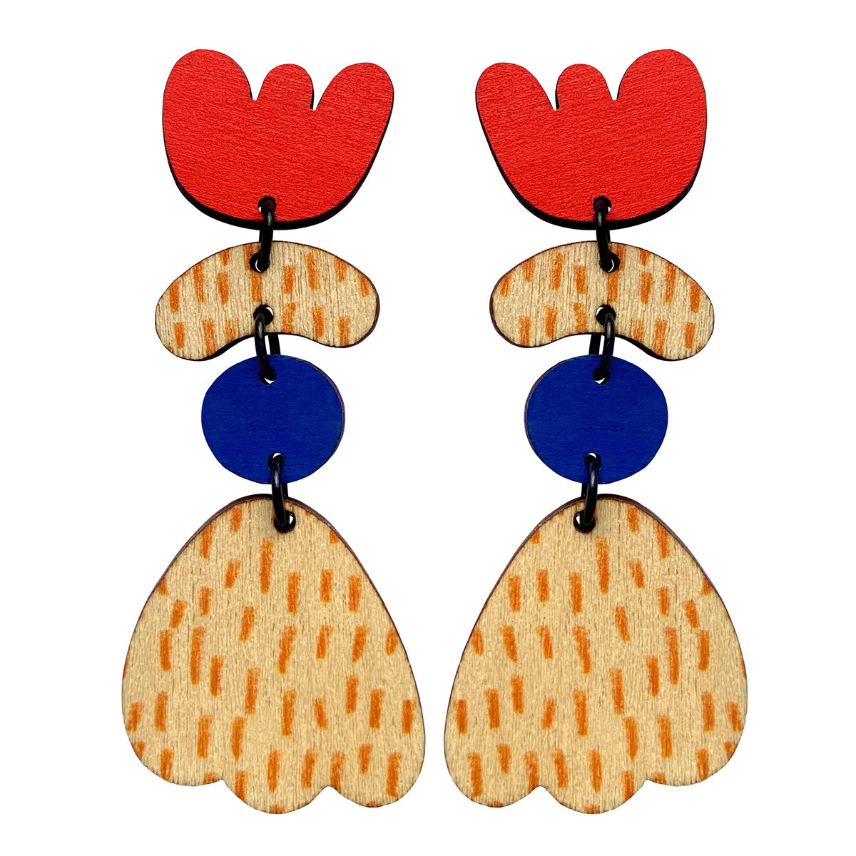 Make a statement with these lightweight earrings made from recycled plywood. Each design is screen printed and hand painted. Stud earrings are made with surgical steel ear posts and backs. The earrings are 3 cm wide by 7.3 cm high at the tallest point and 0.3 cm deep. These come packaged in a beautiful box.