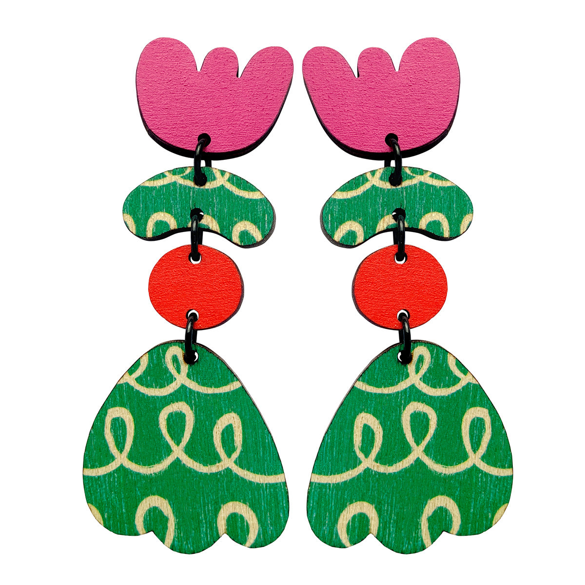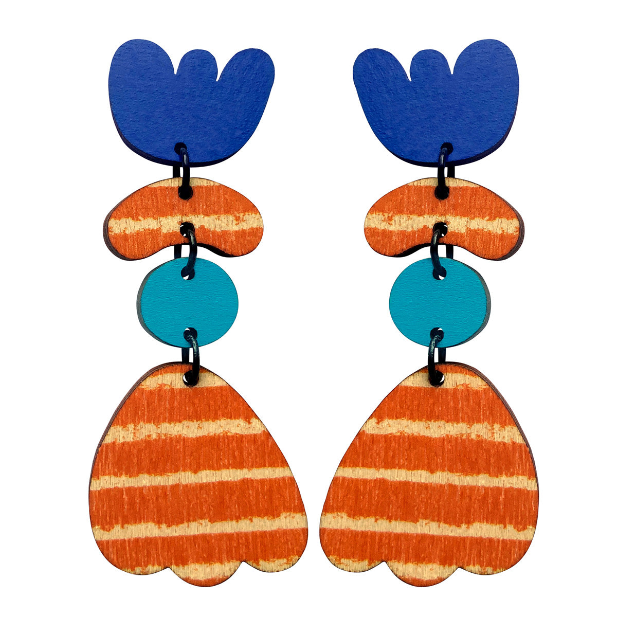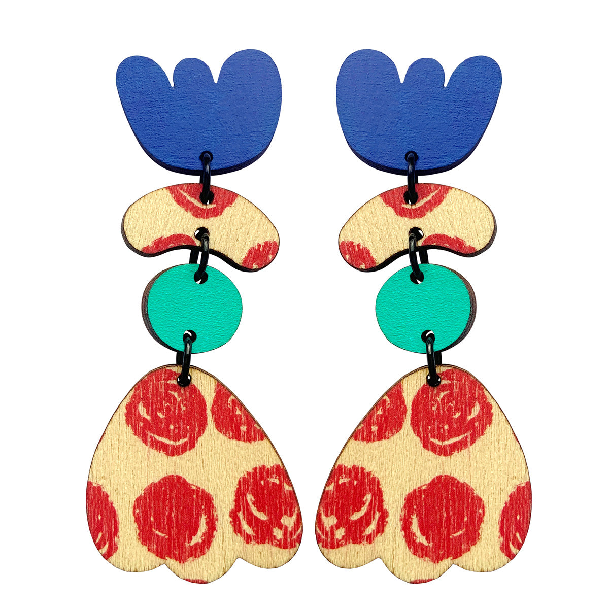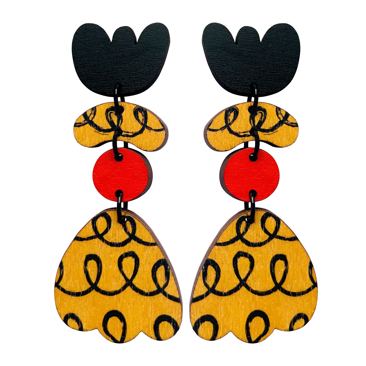 Make a statement with these lightweight earrings made from recycled plywood. Each design is screen printed and hand painted. Stud earrings are made with surgical steel ear posts and backs. The earrings are 3 cm wide by 7.3 cm high at the tallest point and 0.3 cm deep. These come packaged in a beautiful box.