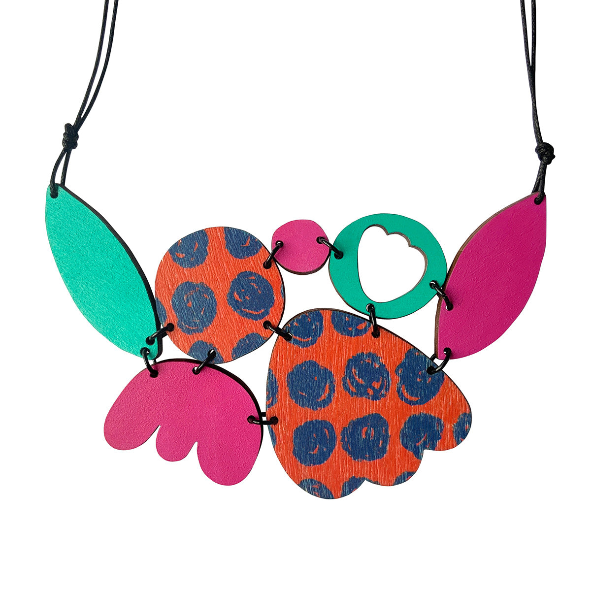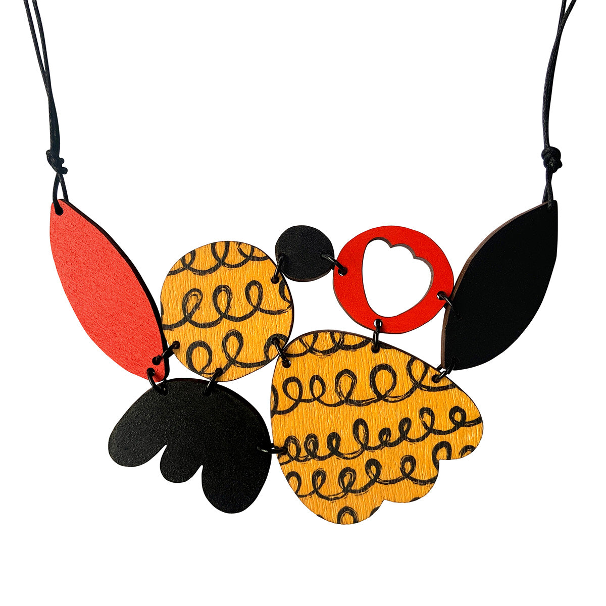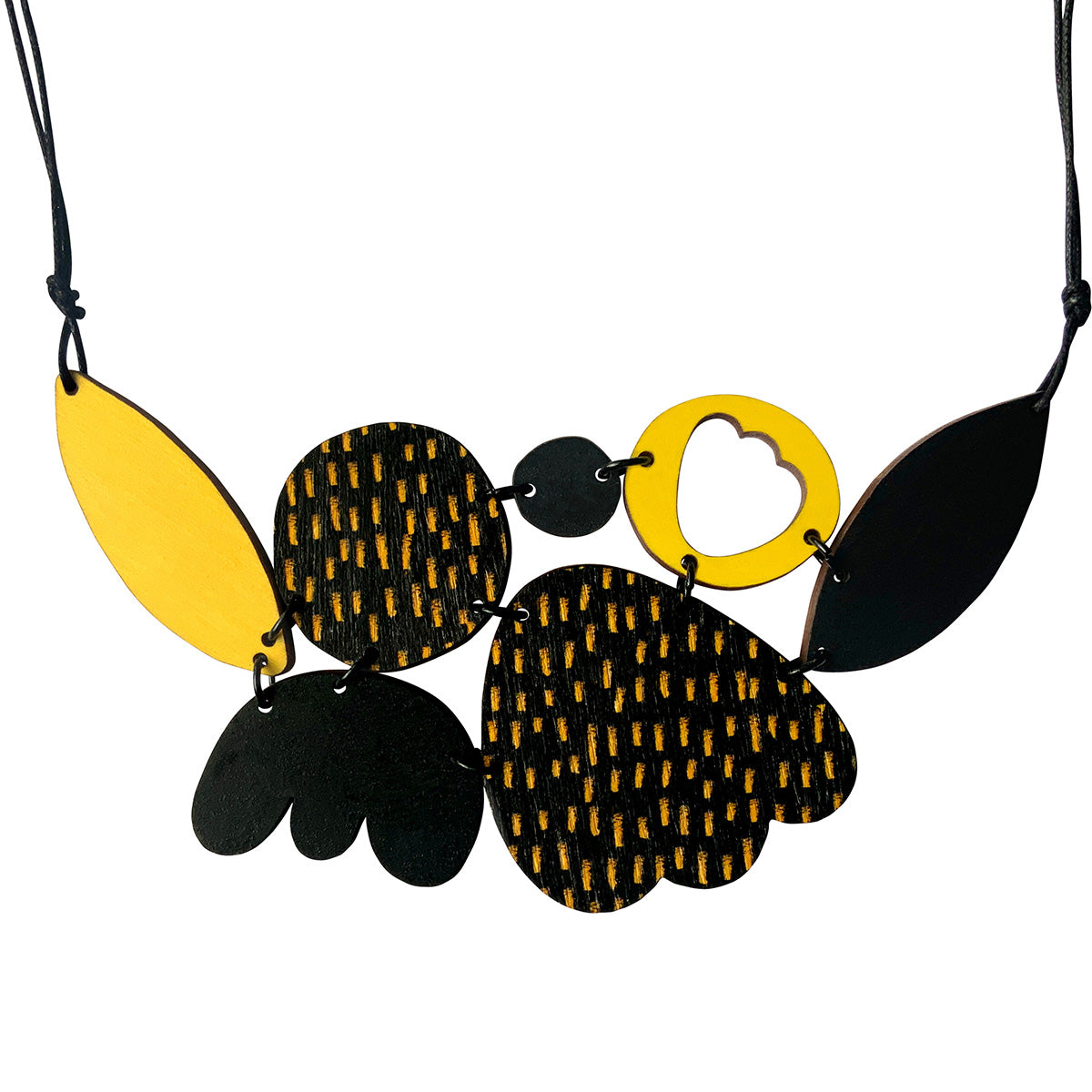 Make a statement with this 7 piece necklace made from recycled plywood. Each design is screen printed and hand painted. Necklaces come with toggle ends and are packaged in a beautiful box. The length of each tie is 40 cm and can sit mid or high on the neck. The ties are made from black cotton cord. The necklace is 13 cm in width, 6.7 cm tall and 0.3 cm deep.