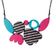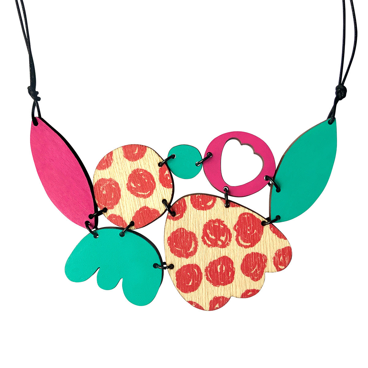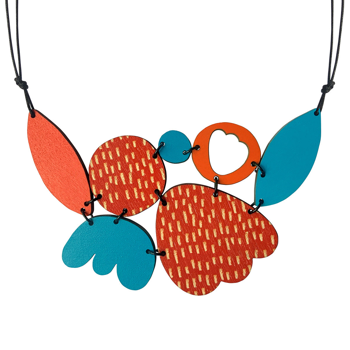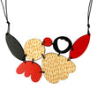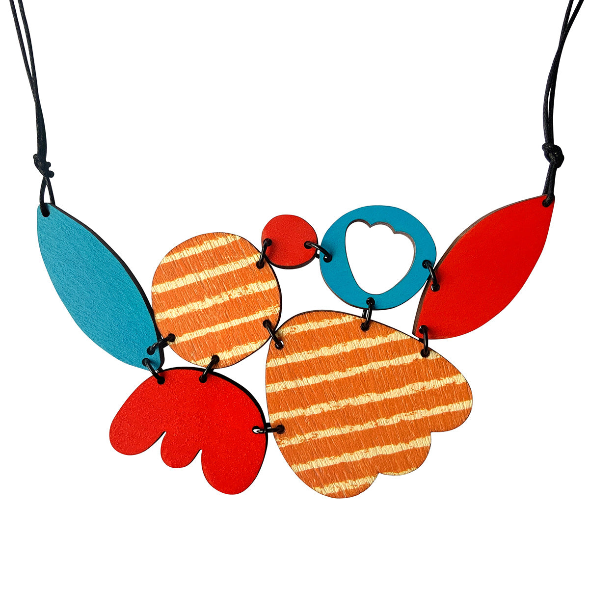 Make a statement with this 7 piece necklace made from recycled plywood. Each design is screen printed and hand painted. Necklaces come with toggle ends and are packaged in a beautiful box. The length of each tie is 40 cm and can sit mid or high on the neck. The ties are made from black cotton cord. The necklace is 13 cm in width, 6.7 cm tall and 0.3 cm deep.