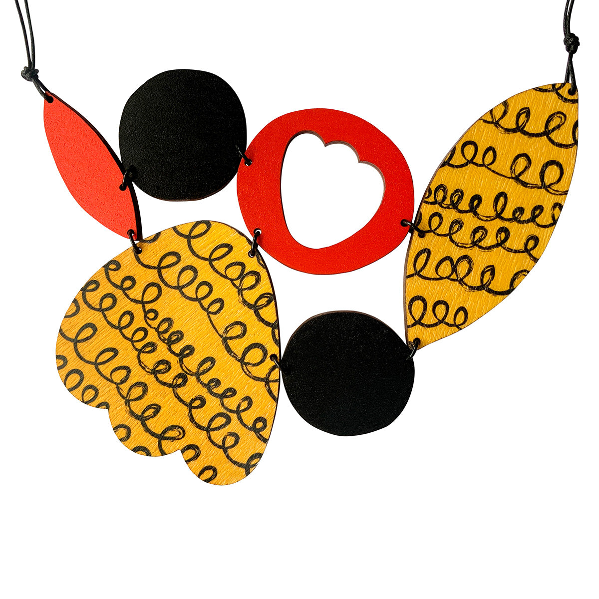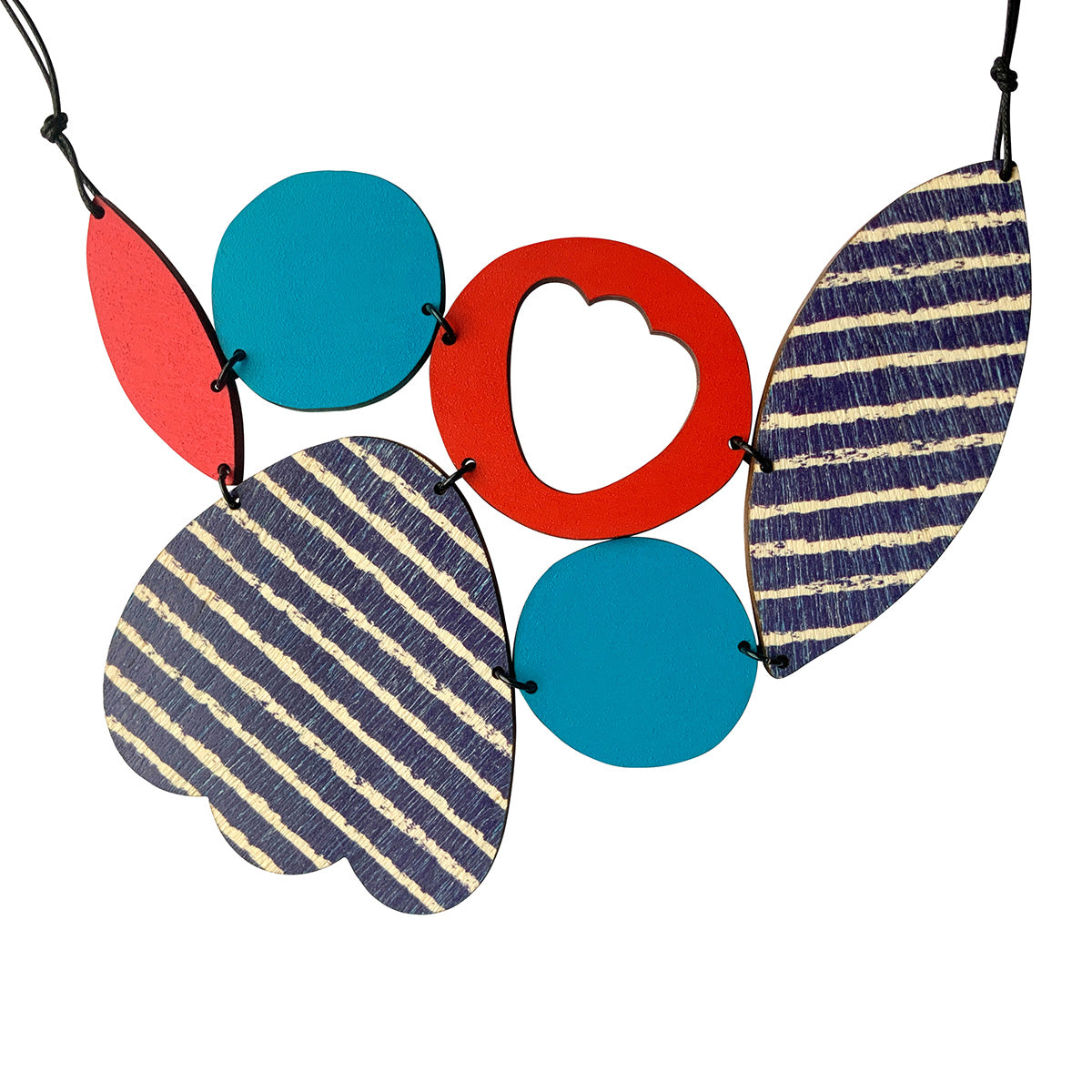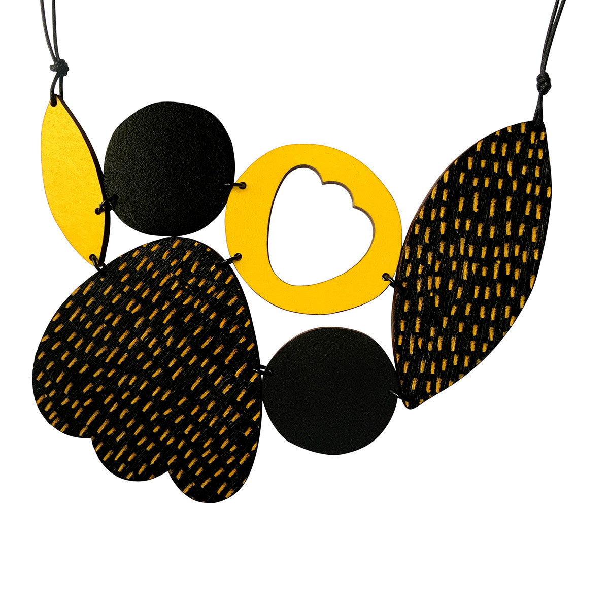 Make a statement with this 6 piece necklace made from recycled plywood. Each design is screen printed and hand painted. Necklaces come with toggle ends and are packaged in a beautiful box. The length of each tie is 40 cm and can sit mid or high on the neck. The ties are made from black cotton cord. The necklace is 16 cm in width, 11.5 cm tall and 0.3 cm deep.