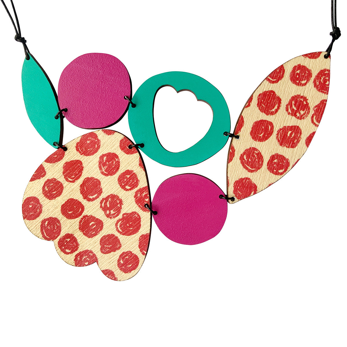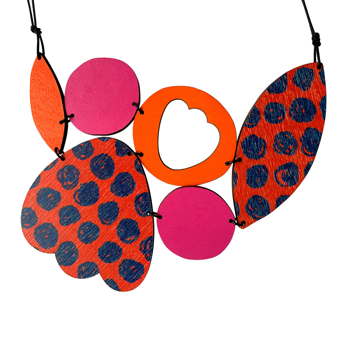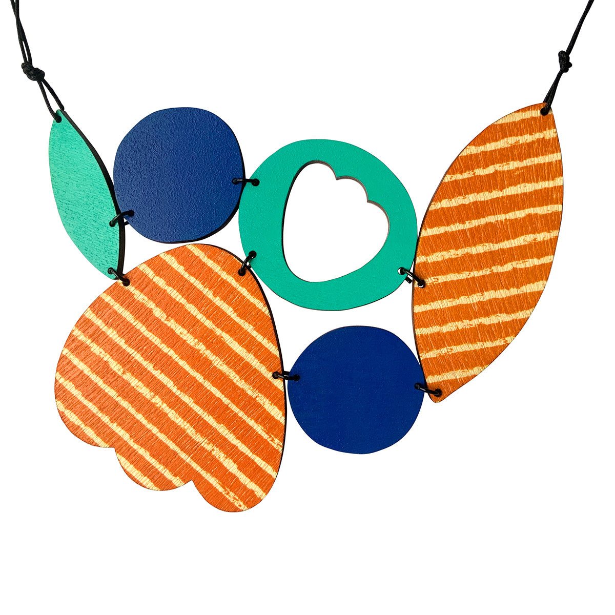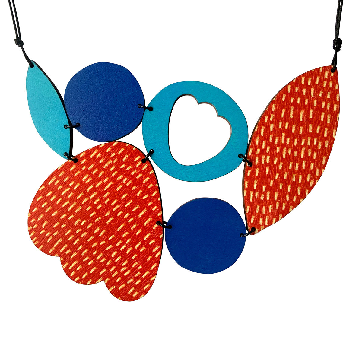 Make a statement with this 6 piece necklace made from recycled plywood. Each design is screen printed and hand painted. Necklaces come with toggle ends and are packaged in a beautiful box. The length of each tie is 40 cm and can sit mid or high on the neck. The ties are made from black cotton cord. The necklace is 16 cm in width, 11.5 cm tall and 0.3 cm deep.