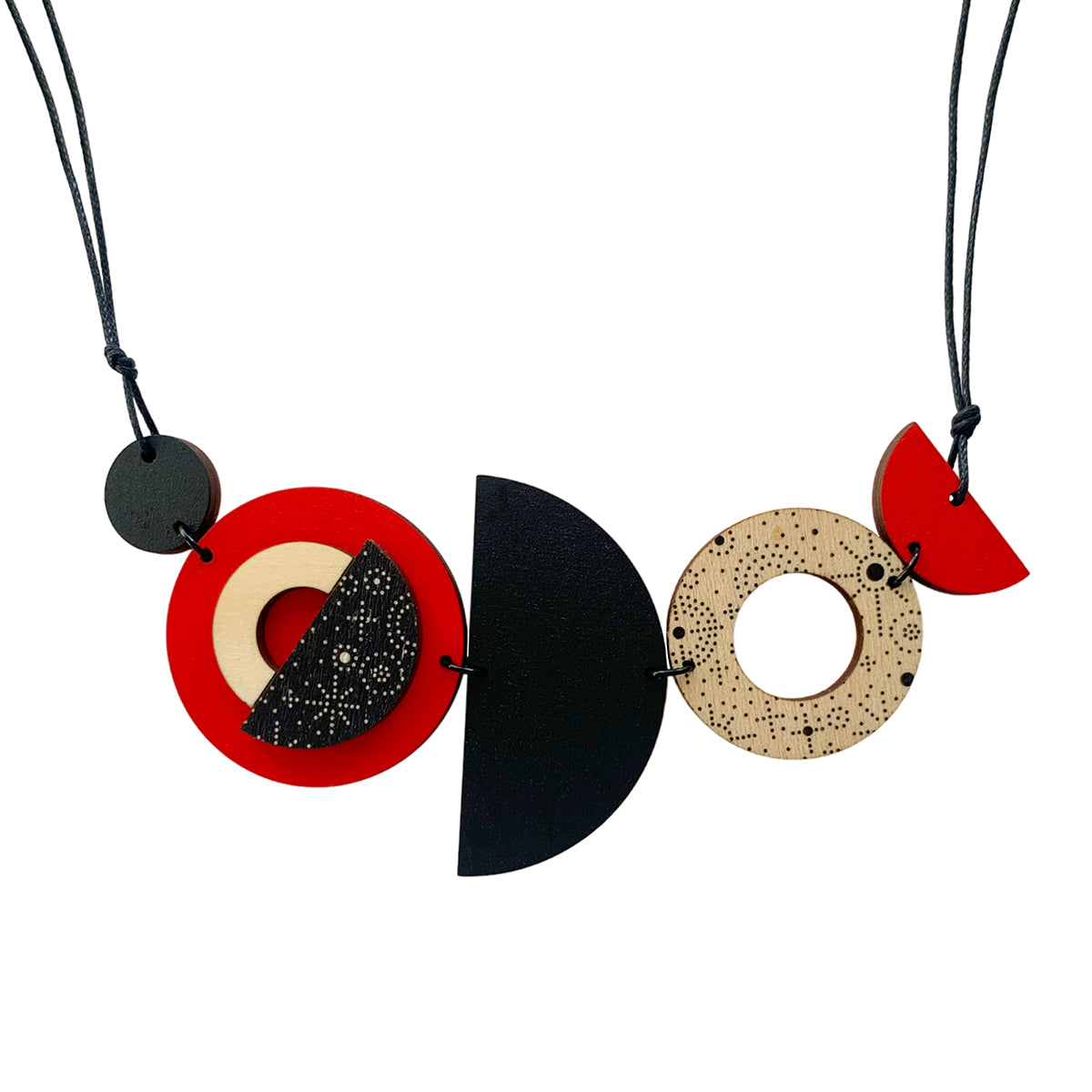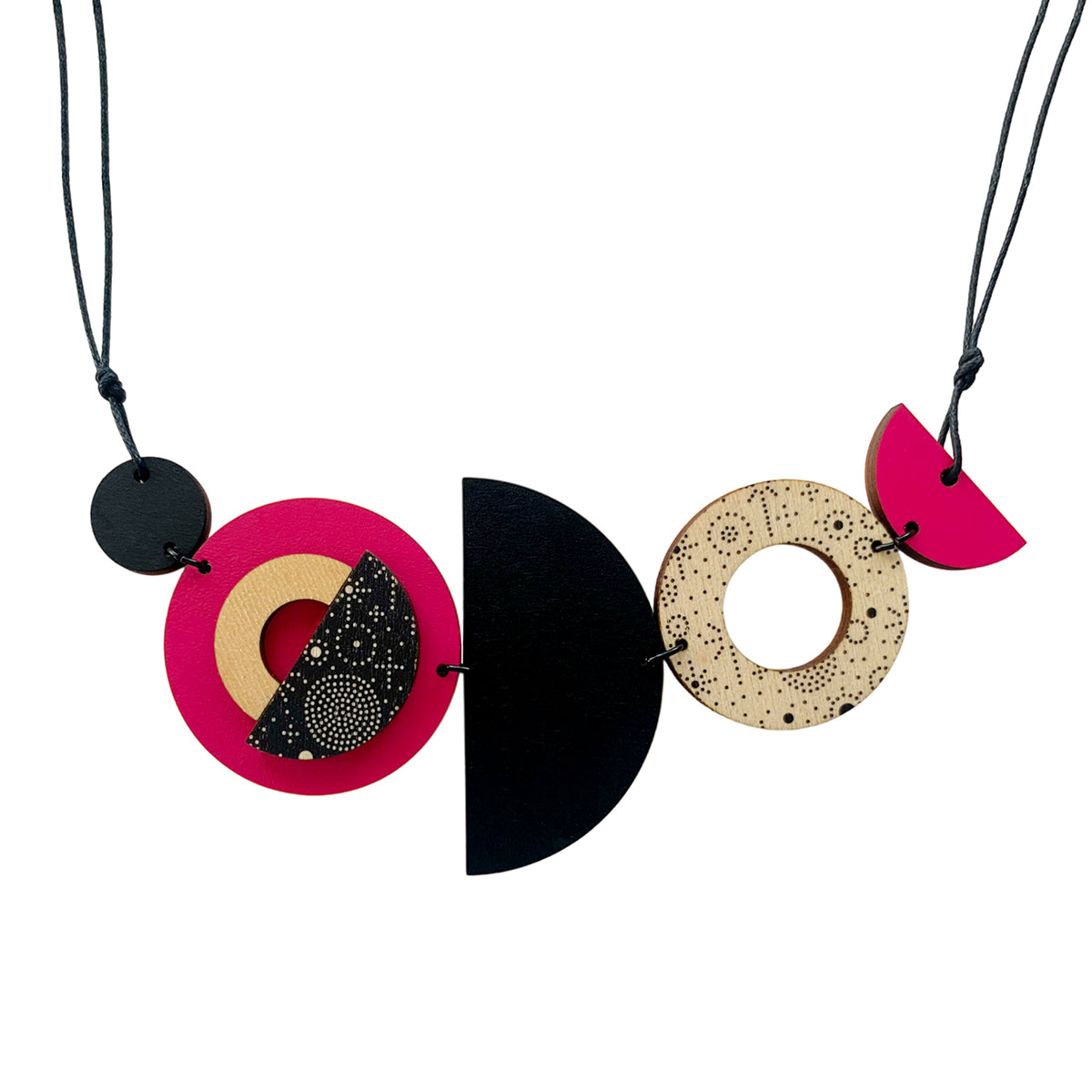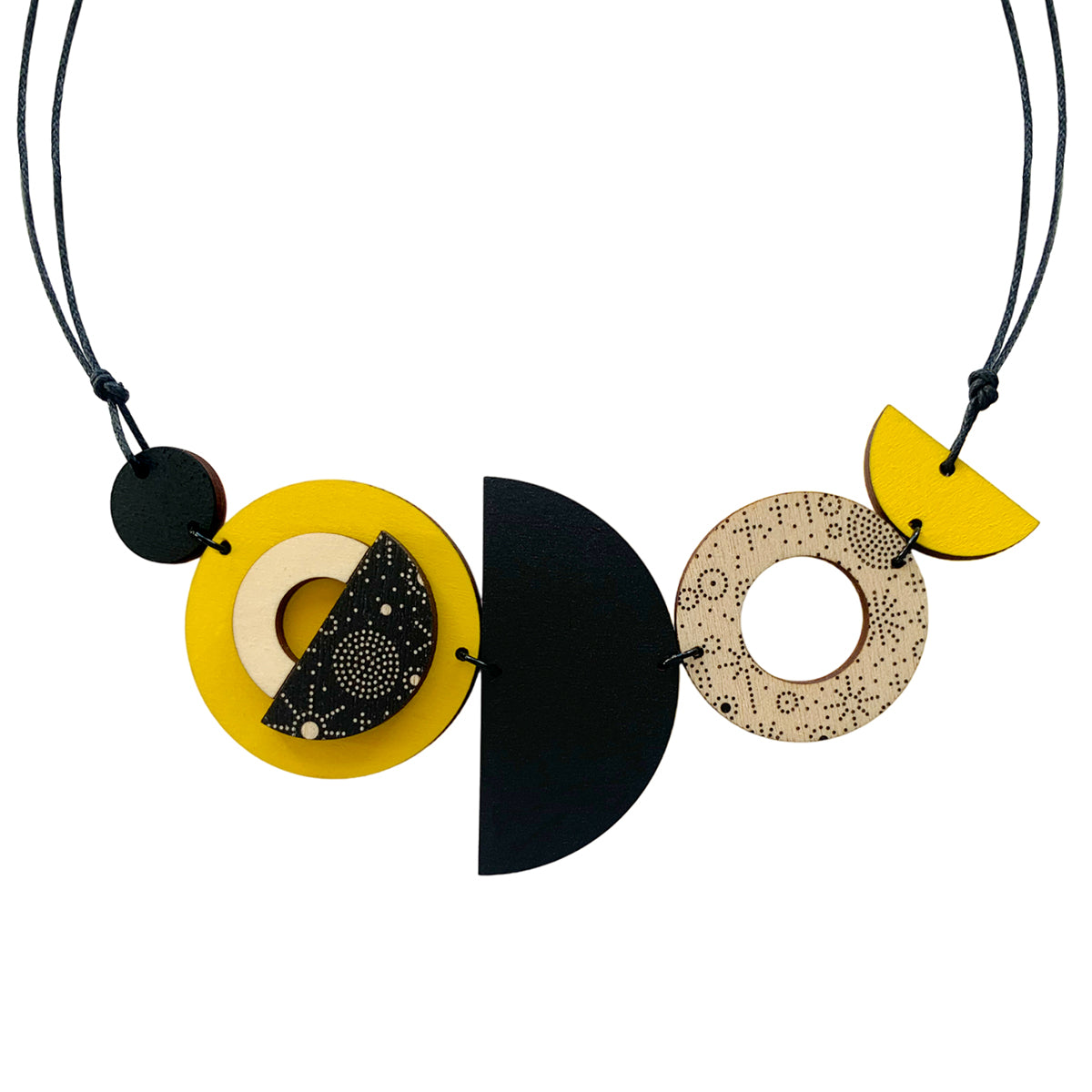 These geometric designed necklaces come with toggle ends and are packaged in a beautiful box. The length of each tie is 40 cm and can sit mid or high on the neck. The ties are made from black cotton cord. The necklace is 14.2 cm wide, 5.8 cm high and 0.6 cm deep.