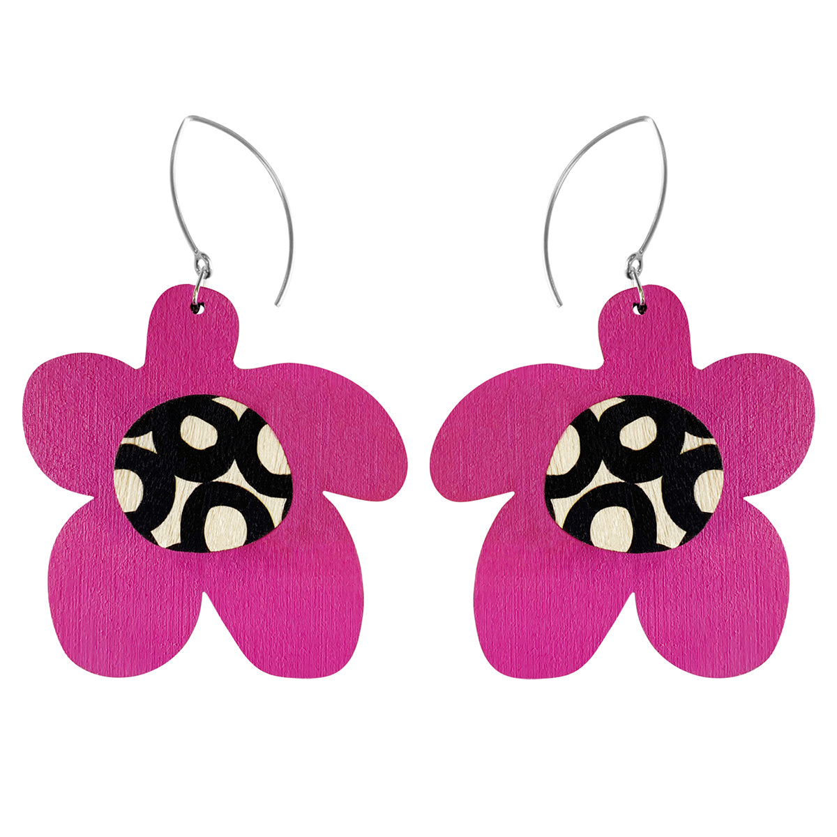 Brighten up your day with these gorgeous pink flower drop earrings. Made from sustainable plywood and sterling silver ear parts these earrings are very lightweight. Both sides of the earring are hand painted and designed add some fun to your outfit! These come packaged in a beautiful box.
